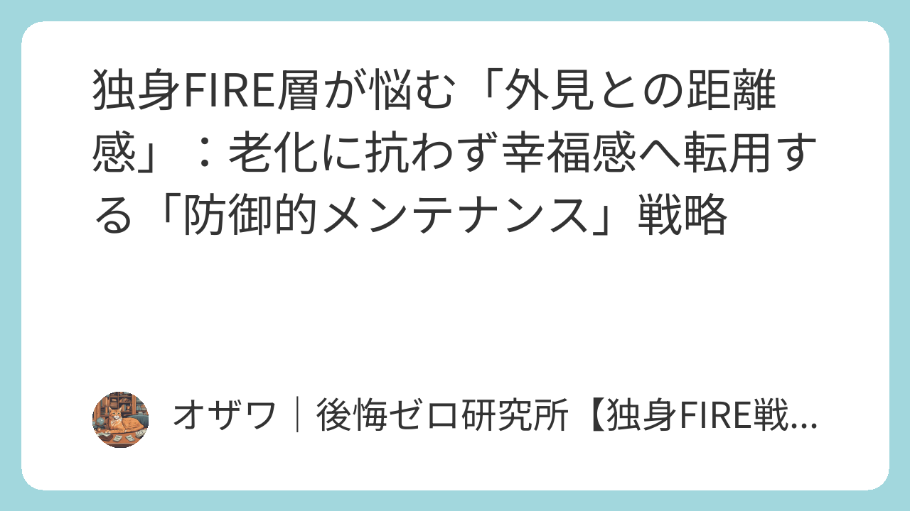 - 外見への過剰にこだわりを捨て、「機能を維持する最低限のメンテナンスを怠った後悔」を最小化することに集中すべきです。この論理的な距離感がFIRE後の幸福感を最大限に高めます。