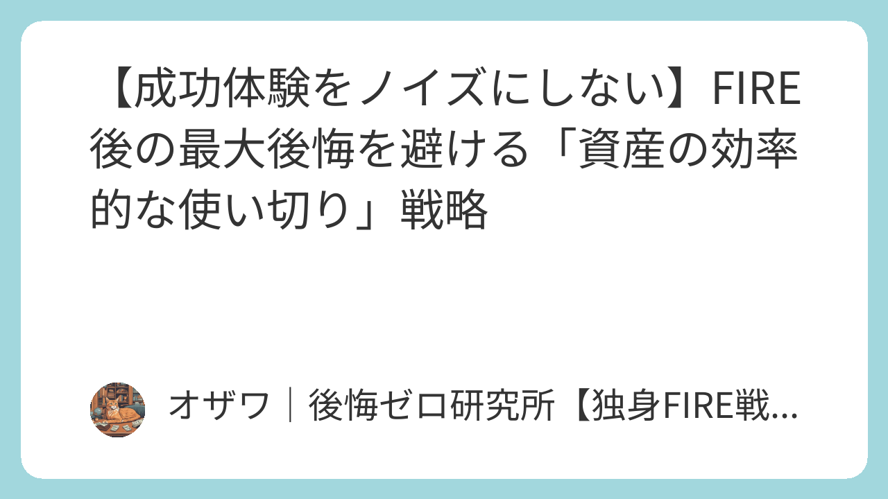 FIRE後の後悔最小化の鍵は、「過去の成功体験というノイズ」を認識し、リソースを「金融資産から非課税資産(時間と健康)」へ意識的にシフトすることにあります。