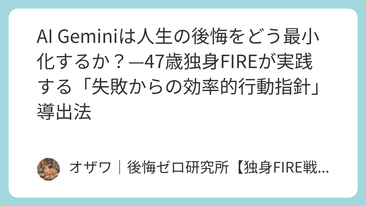 知識への投資を怠り、税制変更・詐欺・技術革新といった外部リスクで資産を失うことは、FIRE層にとって最大の後悔の一つです。Geminiを活用し、常に防御戦略の設計図をアップデートします。