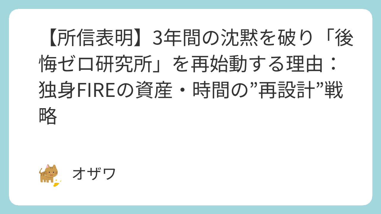 このブログは、約3年間、更新を停止しておりました。しかし、47歳でFIREを達成した今、私の人生の目標は「人生全体を振り返ったときの後悔の最小化」へと完全にシフトしました。