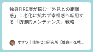 FIRE 📝 独身FIRE層が悩む「外見との距離感」:老化に抗わず幸福感へ転用する「防御的メンテナンス」戦略 FIRE後の「外見放置」は、自分を大事にする気持ち(自己肯定感)の低下というノイズを招きます。本記事では、老化に抗う努力を捨て、「機能を維持する」という論理的距離感を確立し、幸福感という非課税資産へ投資する最も効率的な「防御的メンテナンス」戦略を解説します。 2025.11.05 FIRE健康